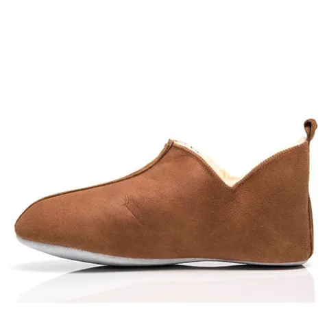 Lækker hjemmesko med hælkappe og trækfane. Overdelen er af nubuck med detaljer af ruskind, og ydersålen er af ruskind. Indvendig har hjemmeskoen et tykt foer af uld.