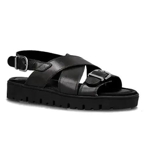 Smart Blair sandal fra Shoedesign Copenhagen af sort glat skind. Sandalen har en rem med et spænde over forfoden, krydsrem på vristen og justerbar hælrem med spænde. Dæksålen er blød og komfortabel, og den grove ydersål sørger for, at du står godt fast. Sandalen har et stilrent look, som mikset med nogle velovervejede detaljer giver den lidt kant. Kan styles til både hverdag og pænere brug.