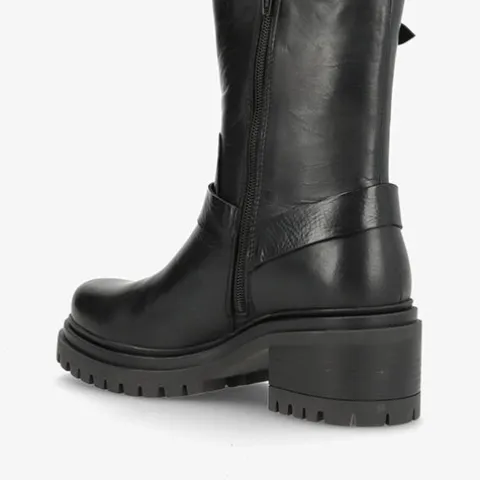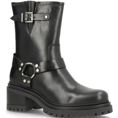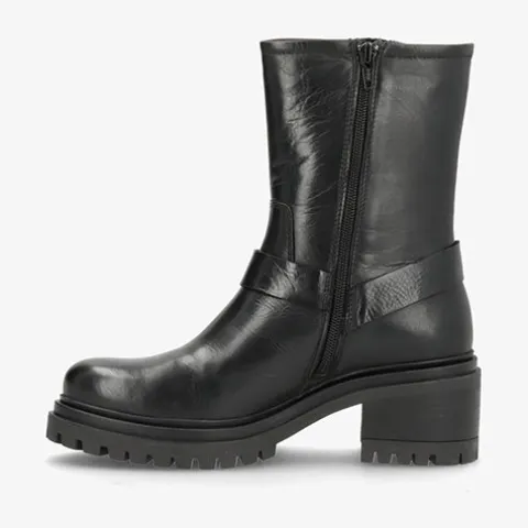 Lækker Sally støvle i biker-look. Overdelen er af glat skind dekoreret om anklen med remme med nitter samlet i en O-ring, og en rem med spænde pryder ydersiden af skaftet. Støvlen lukkes med en lynlås på indersiden af anklen. Indvendig har støvlen et blødt tekstilfoer, og indersålen er beklædt med skind. Den kraftige ydersål er stødabsorberende med et godt fodfæste, og den 6 cm høje blokhæl føles behagelig med en 2,5 cm plateausål under forfoden.