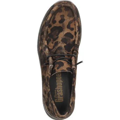 Komfortabel Grashopper sko med en overdel af blødt ruskind i flot leopardprint. Skoen kan være en slip on-model med den praktiske elastiksnøre, men udskift elastikken med snørebåndet, og så har du en snøresko. Indersålen kan tages ud, og den fleksible ydersål er blød og stødabsorberende med et godt fodfæste. Modellen er meget let, komfortabel og alsidig. Fås i halve størrelser.