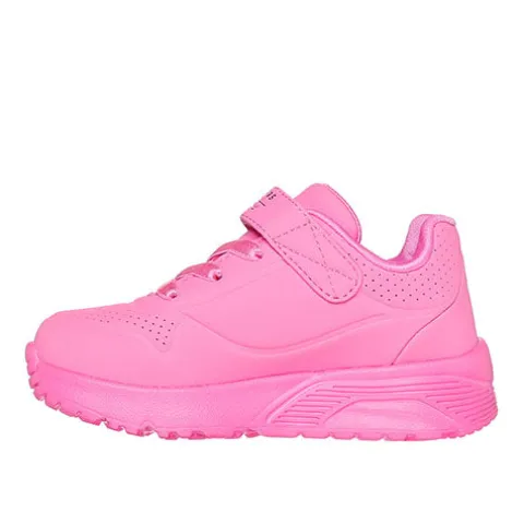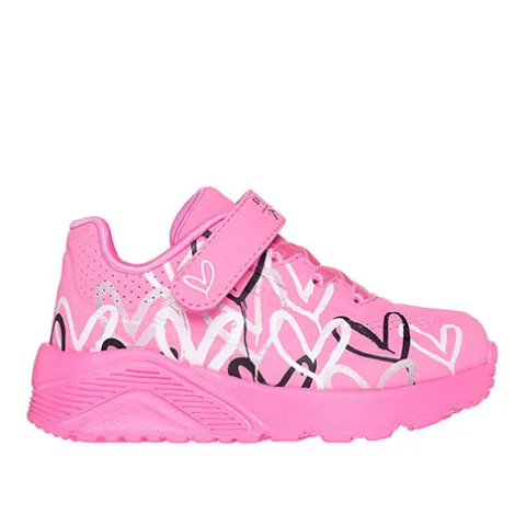 Supersmarte Uno Lite – Love Levitate sko med en overdel af perforeret syntetisk durabuck dekoreret med med hvide, sorte og sølvfarvede hjerter. Denne sko er resultatet af det inspirerende samarbejde mellem Skechers og den anerkendte kunstner James Goldcrown, som bringer sine ikoniske Lovewall-hjertedesigns til Skechers. Skoen er en Easy on-Easy off-model med Adaptive Closure, så den lukkes med en velcrorem over vristen, imens et ikkejusterbart elastiksnørebånd sørger for tilpasning til foden i løbet af dagen. Åbningen er polstret for øget komfort, og indersålen med Air-Cooled Memory Foam® er blød og stødabsorberende. Den lette ydersål er fleksibel og stødabsorberende med et fint fodfæste. Kan maskinvaskes ved maks. 30 grader. Her får du en helt unik og komfortabel sko.