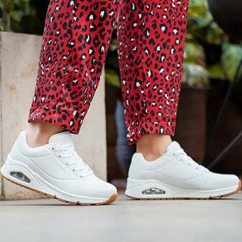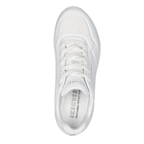 Lækker Street Wide Fit Uno – Stand On Air sneaker med en overdel af durabuck, som er perforeret på forfoden og om hælen. Skoen lukkes med snørebånd, og åbningen er polstret for øget komfort. Den polstrede Air-Cooled Memory Foam-indersål er komfortabel og giver dig god støtte hele dagen, imens EVA-mellemsålen med den synlige Skech-Air luftboble er stødabsorberende og har en kilepasform med skjult 2,5 cm hæl. Den fleksible gummiydersål er stødabsorberende med et godt fodfæste.