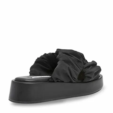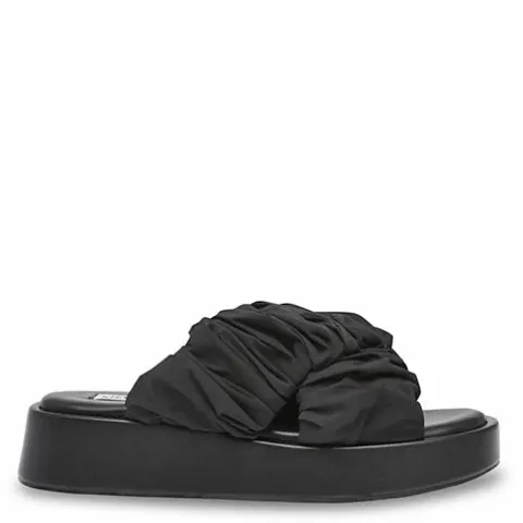 Lækker Bellshore slip-on-sandal med to brede remme beklædt med tekstil med rynket effekt, der krydser hinanden over vristen. Indersålen er blød, og ydersålen sikrer dig et godt fodfæste med sine riller.