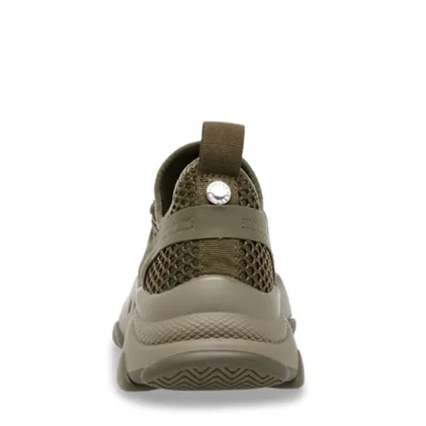 Army farvet sneaker fra Steve Madden med sølvfarvet logoknap bagpå stroppen og tone-i-tone ydersål. Der er stræk i overdelens tekstilmateriale og skoen tages på som en sok. Modellen kan strammes ind med elastik foran.