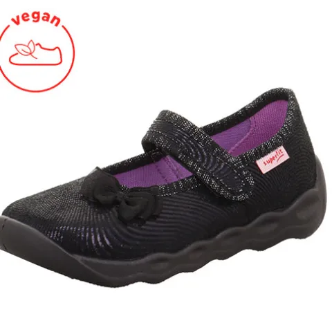 Dejlig Bubble hjemmesko med en overdel af tekstil med en speciel effekt, dekoreret med en chiffonsløjfe på forfoden. Skoen lukkes med en velcrorem over vristen. Den fleksible og stødabsorberende ydersål har lufthuller underneden for øget åndbarhed. Er 100 % vegansk.