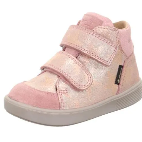 Sød Supies overgangsstøvle af ruskind, tekstil og glittereffekt med stjerner. Støvlen lukkes med to velcroremme og er udstyret med Gore-Tex-membran, der gør støvlen vandtæt, lun og åndbar. Indersålen kan tages ud, og ydersålen er fleksibel.
