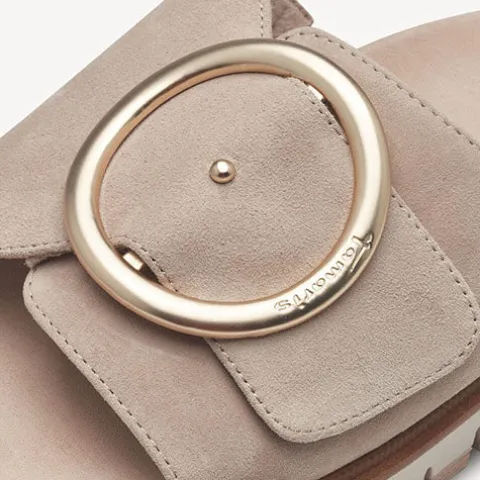 Dejlig og komfortabel Comfort sandal med en overdel af blødt ruskind foret med blødt tekstil. Sandalen er en slippers-model med en bred, justerbar velcrorem over forfoden, dekoreret med en stor guldfarvet ring. Med Wide Fit er sandalen mere rummelig om forfoden, og den skindbeklædte dæksål er meget polstret og blød, så komforten er i top hele dagen. Den fleksible gummiydersål har dybe riller og er stødabsorberende med et godt vejgreb. Hæl- og plateauhøjden er ca. 4 cm.