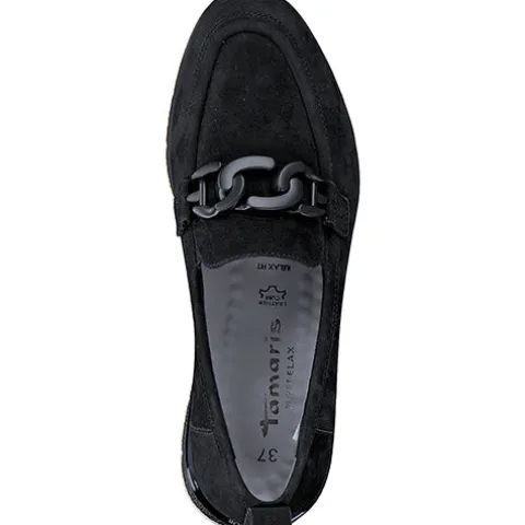 Pure Relax Fit Navy loafer fra Tamaris er sporty og elegant på samme tid med sin klassiske form og den lidt kraftigere sål, der er hvid forneden. Skoen har flere smarte detaljer, bl.a. en trækfane bagpå, der gør det nemt at komme i skoen, samt en sort kæde henover vristen. Elastik på begge sider i åbningen gør det nemt at komme i og ud af skoen. Skoens overdel er nubuck, og den bløde Relax Fit-indersål, som har en smule pelotte og hælpude, er læder og yder en god komfort. Foeret er af genanvendte materialer for øget bæredygtighed.