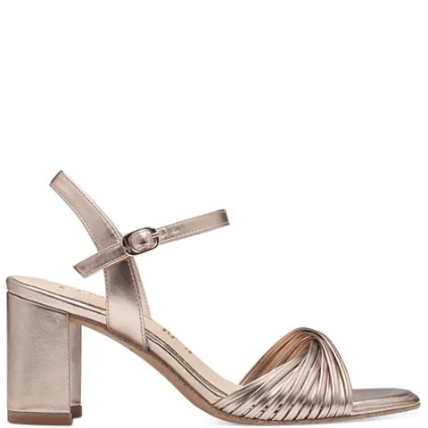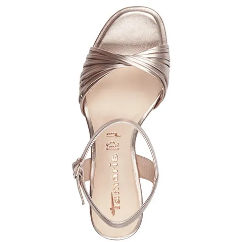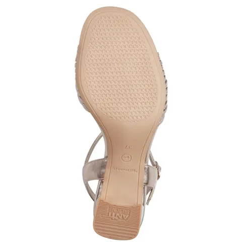 Flot sandal med en overdel af rødguldsfarvet syntet i læderlook. Masser af smalle remme krydser over hinanden på forfoden, imens en hælrem samt en ankelrem med spænde holder skoen på plads på foden. Den polstrede Touch it-indersål er belagt med skind, hvilket øger komforten. Den 8 cm høje blokhæl har AntiSlide, imens ydersålen under forfoden er af gummi.