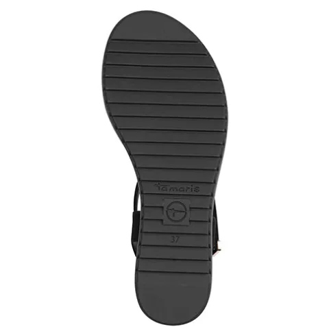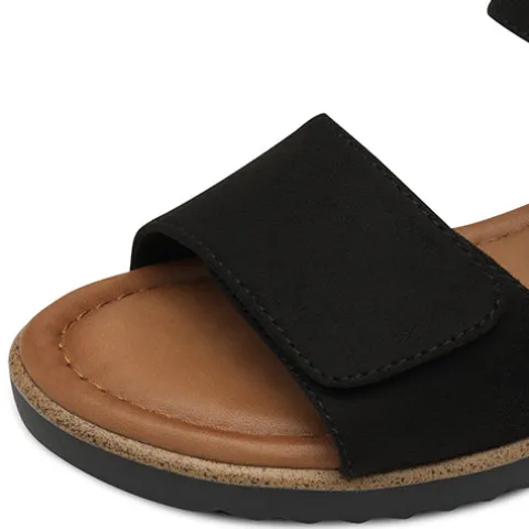 Flot sandal med en overdel af tekstil i ruskindslook. Sandalen lukkes med to velcroremme (forfod og vrist), og den øverste rem er dekoreret med et guldfarvet metallogo. Sandalen er ekstra feminin med den 4,5 cm høje kilehæl, som er beklædt med kork, og den ca. 1,5 cm høje plateausål under forfoden får sandalen til at føles som blot 3 cm høj, når du har den på. Komforten øges yderligere af den polstrede Touch It-indersål. Den kraftige ydersål er stødabsorberende og giver med sine riller et godt fodfæste. Sandalen er 100 % vegansk.