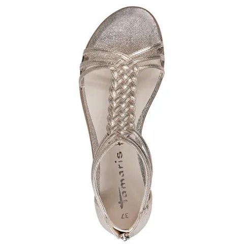 Rigtig fin guldsandal med flet på vristen. Sandalen lukkes med lynlås på den lukkede hælkappe. God til forårets og sommerens fester.