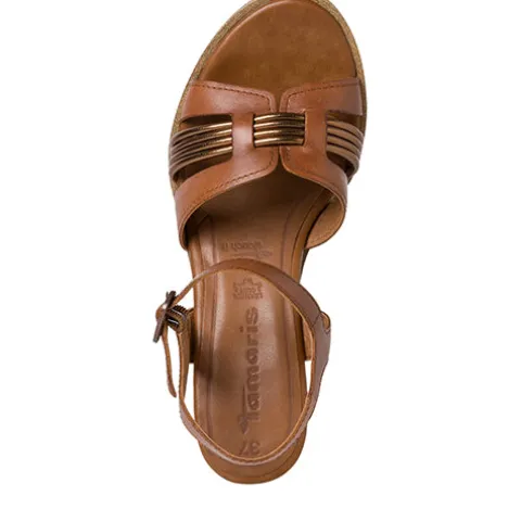 Lækker og blød sandal fra Tamaris i skind og syntet. Touch it-indersålen, som er læder, gør sandalen behagelig at have på, selv med en hælhøjde på 8 cm. Med plateausål på ca. 2 cm under forfoden er den oplevede hælhøjde kun ca. 6 cm. Sandalen har mange spændende detaljer, der gør den mere casual, så den kan bruges til både fest og hverdag.