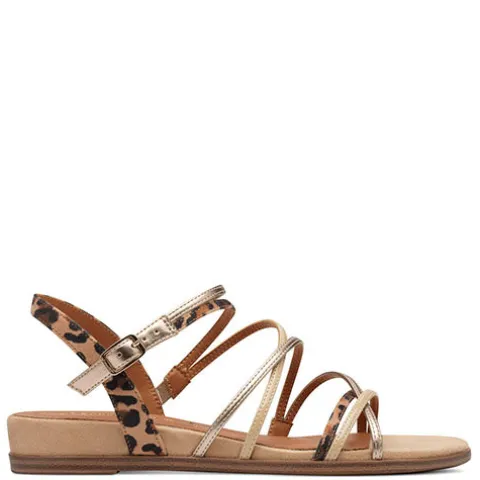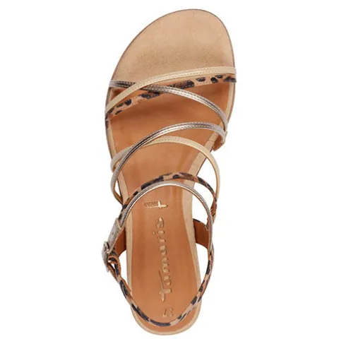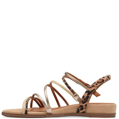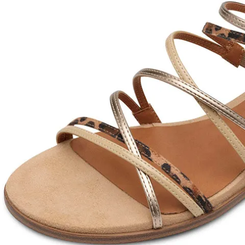 Smart sandal med en overdel af tekstil og syntet med smalle remme i en kombination af guld, beige og leopard. Sandalen lukkes med en rem med spænde. Touch-it-dæksålen er blød og polstret, og den fleksible gummiydersål er støddæmpende med et fint fodfæste. Sandalens diskrete hælhøjde gør den ekstra feminin. 100 % vegansk.