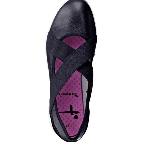 Dejlig sko med en overdel af glat skind med to elastikremme på kryds over vristen. Ydersålen er fleksibel og giver et fint fodfæste.