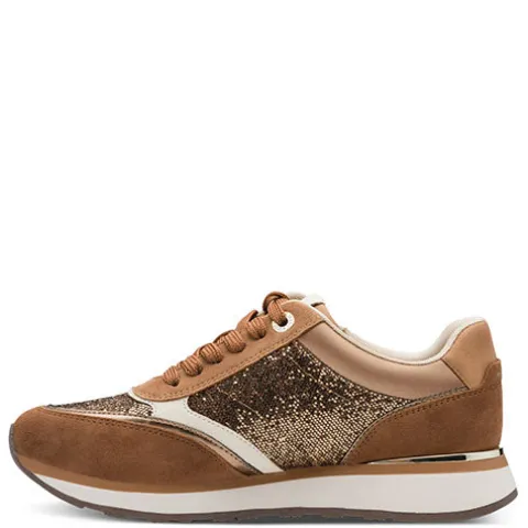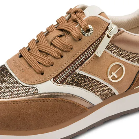 Smart damesneaker med en overdel af ruskind, glat skind, syntet og tekstil med glimmereffekt og syntet med flotte detaljer. Skoen justeres med snørebånd og lukkes med en lynlås på ydersiden af snørebåndet. Åbningen er polstret for øget komfort. Den udtagelige indersål er polstret og komfortabel, og gummiydersålen er stødabsorberende med et godt fodfæste.