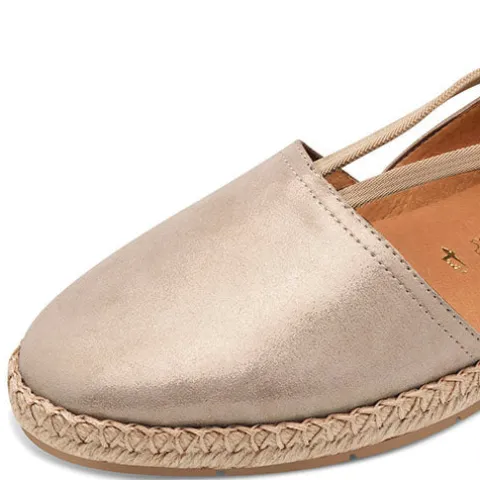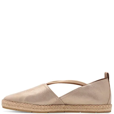 Sød espadrillesko med en overdel af nubuck med guldeffekt. En trækfane på hælen gør det nemt at få skoen på, og to elastikker sørger for at holde foden på plads, imens en elastikkile på indersiden giver individuel tilpasning i løbet af dagen. Touch-It-indersålen er blød og komfortabel og beklædt med skind, og ydersålen er stødabsorberende med et godt fodfæste.