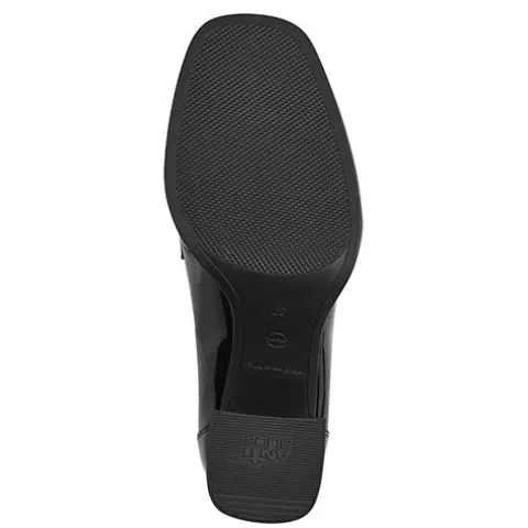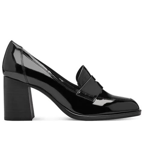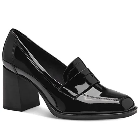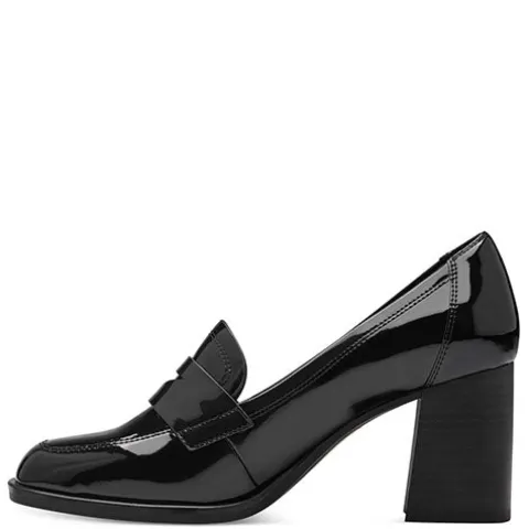 Flot sko i pennyloaferstil med en 7,5 cm høj blokhæl. Overdelen er af lakeret syntet, og Touch-it-indersålen er polstret og komfortabel. Ydersålen har ANTISlide, og skoen er 100 % vegansk.