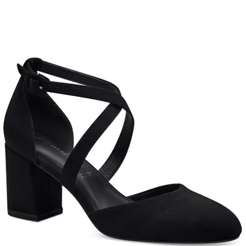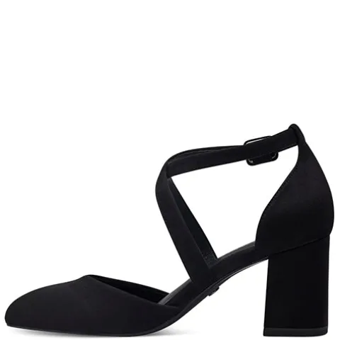 Flot damesko med en 7,5 cm høj blokhæl og en overdel af tekstil i ruskindslook. Skoen lukkes med en ankelrem med spænde, der krydser over vristen, hvilket både holder skoen på plads og giver et ekstra feminint strejf. Touch it-indersålen er polstret for øget komfort, og ydersålen under hælen har Anti-Slide. 100 % vegansk.