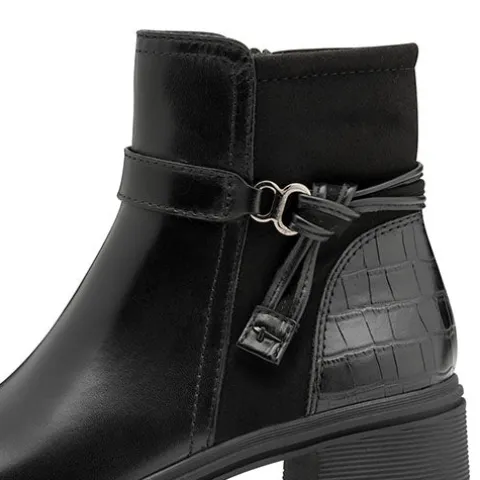 Flot støvle med en overdel af glat skind, tekstil og syntet, dekoreret med en smart rem om anklen. Støvlen lukkes med en lynlås på indersiden af anklen. Med en 5 cm høj blokhæl med gummi og en godt mønstret sål under forfoden får du her en feminin og stødabsorberende støvle med et godt fodfæste.