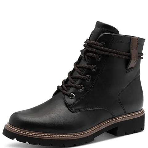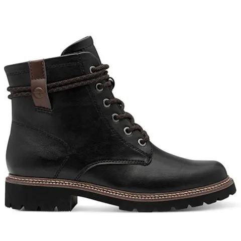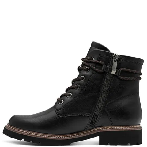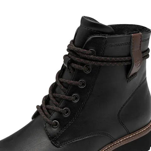 Flot ankelstøvle med en overdel af imiteret glat skind med smarte detaljer, bl.a. går snørebåndet om anklen for et casual look. Støvlen justeres med snørebåndet og lukkes med en lynlås på indersiden af anklen. Indvendig Har støvlen et lunt og let fleecefoer, og indersålen er komfortabel. Ydersålen har et kraftigt mønster og er stødabsorberende med et godt fodfæste. Hælen er 3 cm høj, og sålen under forfoden er 1,5 cm høj.