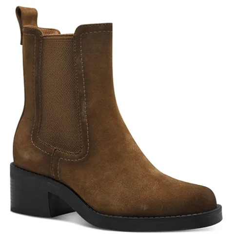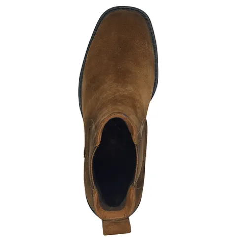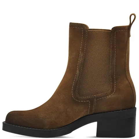Lækker Chelsea-støvle med en overdel af ruskind og elastikpanel på begge sider. En trækfane bagpå gør det nemt at træde i støvlen, som har en polstret og blød indersål. Den prominente ydersål med en 5,5 cm høj blokhæl og 1,5 cm høj forfodsplateau gør støvlen feminin og afslappet på samme tid.