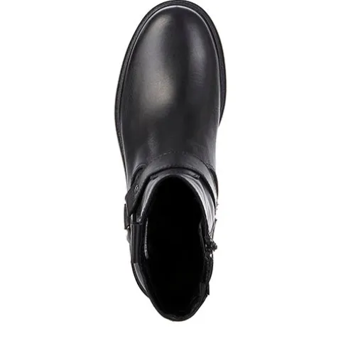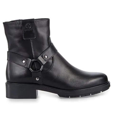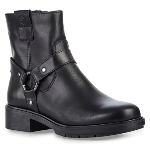 Dejlig støvle med en overdel af glat skind, dekoreret med O-ring og rem om anklen samt en trækfane på ydersiden. Støvlen lukkes med en lynlås på indersiden af anklen og har en lille elastikkile ved siden af. Touch it-indersålen er blød, og den stødabsorberende ydersål giver et fint vejgreb.