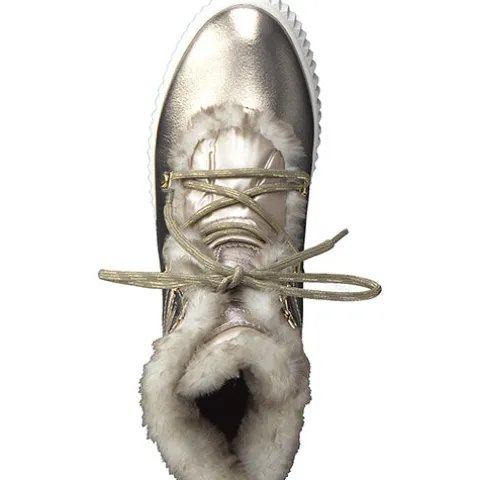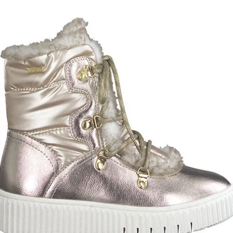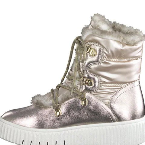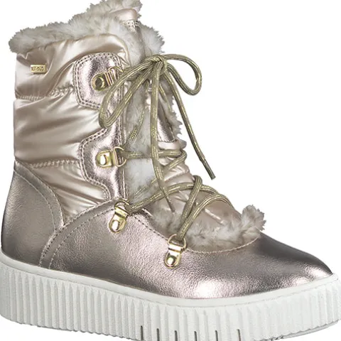 Flot moonboot-agtig støvle fra Tamaris med en vedligeholdelsesvenlig overdel af guldfarvet tekstil og slidstærkt syntet. Støvlen lukkes med snørebånd på skaftet. DuoTEX gør støvlen vandafvisende, og den bløde fodseng tilpasser sig fodens naturlige form. Den kraftige gummiydersål giver et godt fodfæste.