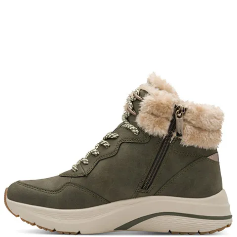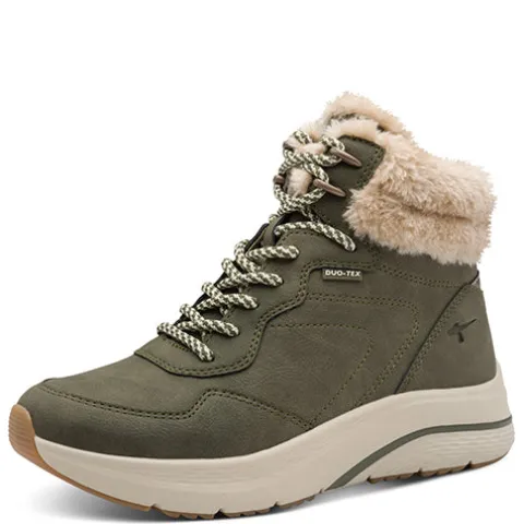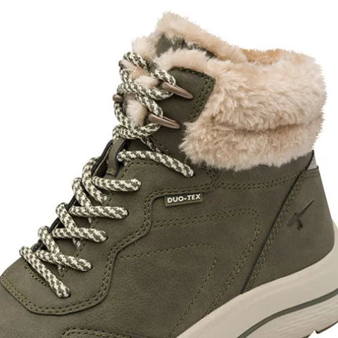 Lækker vinterstøvle med en overdel af skind, tekstil og syntet. Støvlen justeres med snørebånd og lukkes med en lynlås på indersiden af anklen. Indvendig har støvlen et varmt plysfoer, som også pryder åbningen, og sammen med en åndbar og vandafvisende DUOtex-membran holdes fødderne lune og tørre. Den udtagelige termoindersål er komfortabel og kuldeisolerende, og den gummibelagte ydersål er stødabsorberende med et godt fodfæste.