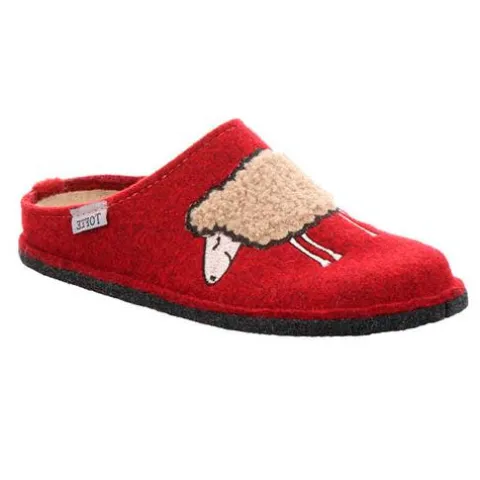 Dejlig slippers-hjemmesko lavet af italiensk uldfilt, dekoreret med et broderet og uldent får på forfoden. Ydersålen består også af uldfilt.