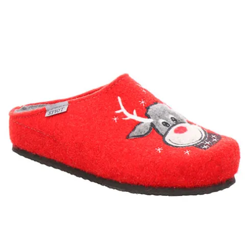 Dejlig og julet slippers-hjemmesko lavet af italiensk uldfilt, dekoreret med et broderet og uldent rensdyransigt på forfoden. Ydersålen består af PU. Du får et diskret løft med en hælhøjde på 3,5 cm samt en plateauhøjde på 1,5 cm.
