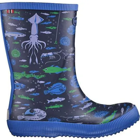 Gummistøvle fra Viking med fiskemotiver. Fremstillet af holdbar naturgummi og har et hurtigttørrende syntetisk for. En udtagelig indlægssål sørger for polstring og isolering, og sålen med det dybe mønster giver et godt greb på jorden – uden at lave mærker på gulvet. Refleksdetaljer sørger for, at børnene er synlige.