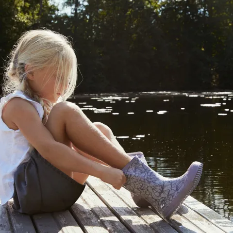 Gummistøvle fra Viking med blomstermotiv og forstærkninger foran. Fremstillet af holdbar naturgummi og har et hurtigttørrende syntetisk foer. En udtagelig indlægssål sørger for polstring og isolering, og sålen med det dybe mønster giver et godt greb på jorden – uden at lave mærker på gulvet. Refleksdetaljer sørger for, at børnene er synlige.