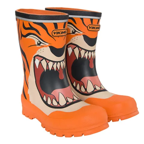 Superfin Jolly Print gummistøvle med print af et brølende tigeransigt. Tåen er forstærket, og en refleksstribe om åbningen og på hælen øger synligheden i mørket. Indvendig har støvlen et blødt tekstilfoer, og indersålen kan tages ud. Den robuste ydersål er stødabsorberende med et godt fodfæste.