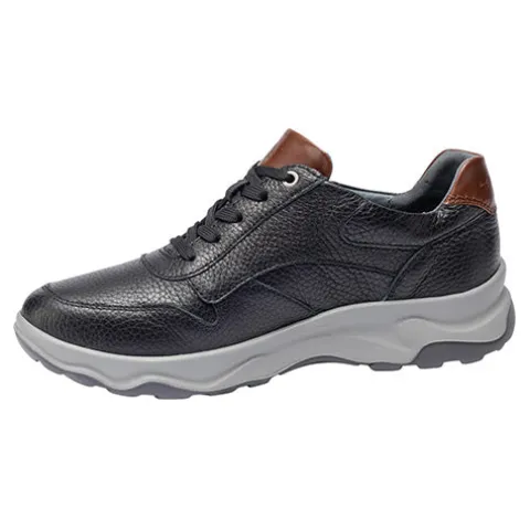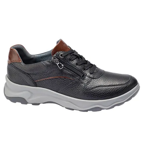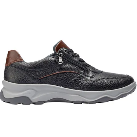 Sporty og robust sko med en behagelig rummelighed i vidde H. Overdelen er af hjortenappa med brune detaljer på pløsen, hælen og siden. Skoen justeres med snørebånd og lukkes med lynlås. Den udtagelige indersål af skind er polstret under svangen og hælen og giver en god komfort. Ydersålen er fleksibel og giver med sit mønster et godt fodfæste.