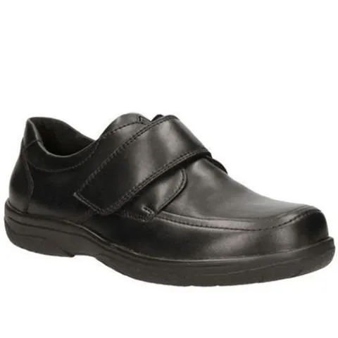 Sort herresko fra det tyske mærke Waldläufer. Skoen er med velcro og rummer en bred fod. Modellen er let og lavet i flot sort skind der kan pudses og plejes så de holder i mange år.