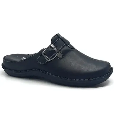 Dejlig slippers-hjemmesko med en overdel af glat skind med kontrastsyninger og en justerbar rem over vristen. Den polstrede, skindbeklædte dæksål er komfortabel, og den fleksible ydersål er stødabsorberende med et fint fodfæste.