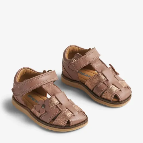 Skøn Sky Flower prewalker-sandal med en overdel af LWG-certificeret glat skind og nubuck med metallisk effekt. Skindet er garvet uden brug af krom og metaller og vil derfor med tiden få en skøn patina. For at sikre, at ingen giftige metaller rører huden, har sandalen et krom- og metalfrit skindfoer. Indersålen er lavet af latex og beklædt med krom-og metalfrit garvet skind. Latex er et naturprodukt, der er åndbart og fleksibelt med en trampolineffekt for behagelige skridt. Sandalen lukkes med to velcroremme, og den ene rem er dekoreret med en sød blomst af skind, fæstnet med en nitte. Åbningen om hælen er polstret for øget komfort og støtte, og sandalen har lukket hæl og tå for en solid pasform og for at give ekstra beskyttelse til de små tæer. Den lette og fleksible ydersål af genanvendt TR-gummi er stødabsorberende med et godt vejgreb. Wheats prewalker-sandal er let, fleksibel og behagelig for dit barn at have på, når de små fødder skal ud på de allerførste eventyr. Sandalen er normal i størrelsen.