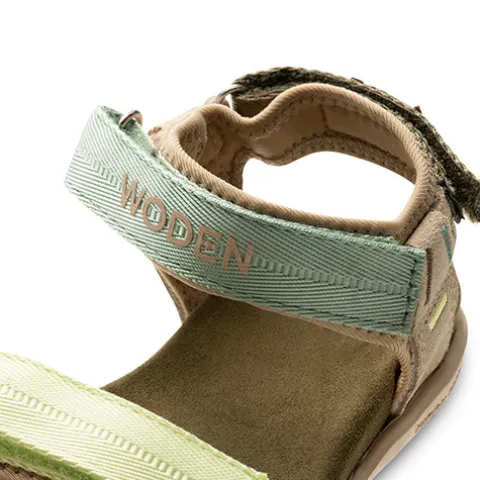 Smart og superblød Cirkeline sandal fra Woden. Sandalen lukkes med tre velcroremme i hver sin farve (forfod, vrist og hæl) og reguleres på forfod og vrist. Hælremmen har en firkantet brun fiskeskindsdetalje, og Woden-logoet sidder på remmen over vristen. Dæksålen, som er tekstilbeklædt, er superblød og komfortabel, og den fleksible ydersål af gummi giver både et godt fodfæste og en god bevægefrihed.