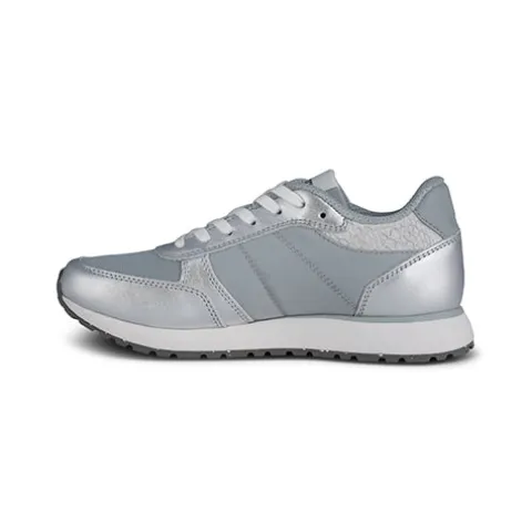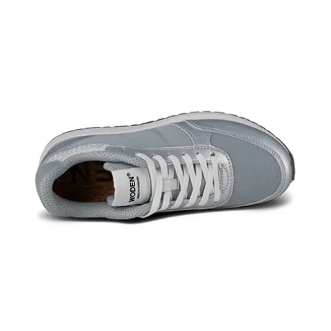 Flot og opsigtsvækkende Ronja Metallic sko med en overdel af LWG-certificeret, sølvfarvet glat skind, ASC-certificeret og genanvendt fiskeskind, tekstil og genanvendt mesh-tekstil. Skoen lukkes med snørebånd, og åbningen er polstret for øget komfort og støtte. Den udtagelige, støbte PU-indersål med korkbeklædning og WODEN Air Flow System™ giver optimal komfort, støtte og åndbarhed. Letvægtsmellemsålen af EVA er stødabsorberende, og den slidstærke gummiydersål med 10 % genanvendt gummi giver med sit mønster et godt fodfæste.