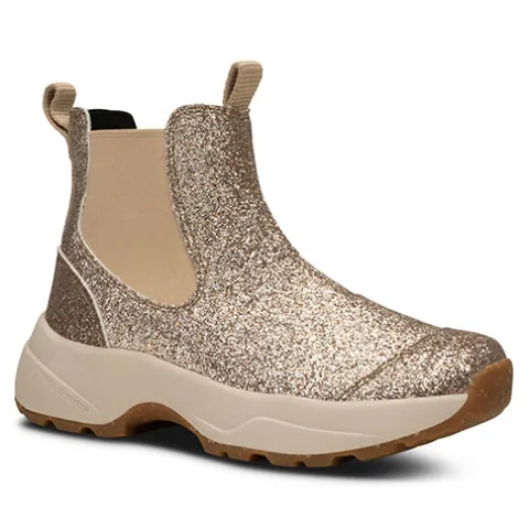 Silje Glitter er en glamourøs ankelstøvle af tekstil med multifarvet guldglitter. Brede elastikpaneler på inder- og ydersiden af anklen giver støvlen en god tilpasningsevne, og trækfaner både for og bag gør det nemt at træde i støvlen, som har en detalje af fiskeskind bag på hælen. Der er brugt blødt PU-skum til den udtagelige indersål, som både er let og stødabsorberende, og indersålens WODEN airflow huller sammen med ydersålens Natural Soft-teknologi sikrer en god åndbarhed i støvlen samt en høj komfort. Støvlen er udformet i et letvægtsdesign, og ydersålens gummibelægning samt det grove mønster giver et godt fodfæste.