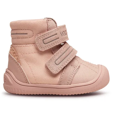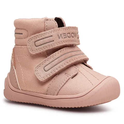 Tristan Boot ll er den optimale begynderbabystøvle. Den er bl.a. fremstillet af ruskind med detaljer af fiskeskind og er foret med genanvendte materialer. Støvlen har refleksdetaljer og lukkes med to velcroremme over vristen, som gør den let at få af og på, og åbningen er polstret for øget komfort. I indersålen, kan tages ud, finder du et blødt underlag i skummaterialet EVA, som er både let og stødabsorberende. Indersålen er beklædt med det karakteristiske WODEN kork, som sikrer åndbarhed. Wodens børnestyles er altid udstyret med et voksetillæg på indersålen, så du kan være sikker på dit barns korrekte størrelse. Ydersålen af gummi er fleksibel og giver et godt fodfæste.