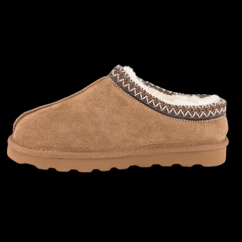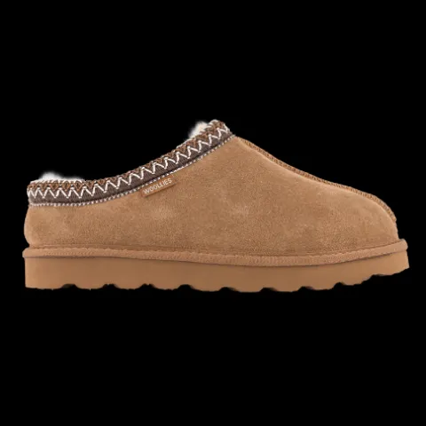 Superlækker Azteca hjemmesko i lammeskind. Overdelen er af ruskind, og indvendig er hjemmeskoen foret med lammeuld, så fødderne holdes dejligt varme. Åbningen er kantet med et smukt tekstilpyntebånd med mønster. Med den kraftige og stødabsorberende ydersål kan denne sko sagtens anvendes udenfor.