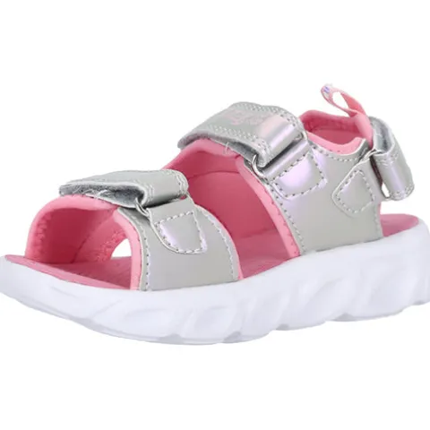 Kaptasia Kids sandalen med lys er en fin pigesandal, der reguleres og lukkes med tre velcroremme (forfod, vrist og hæl). Overdelen changerer smart i sølv og lyserød og har en del sølvglimmer, og ved hvert skridt blinker 5 lys langs ydersiden af mellemsålen.