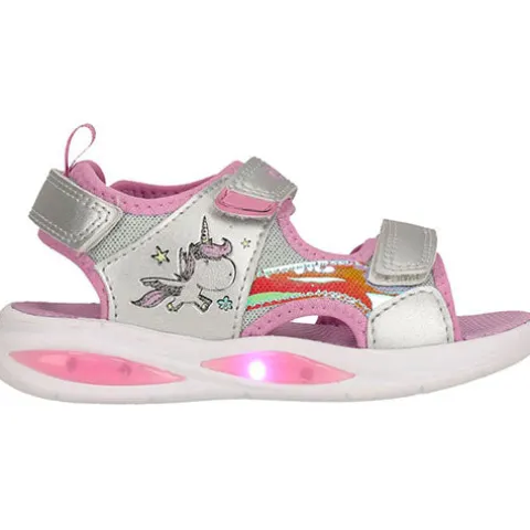 Flot Wiggy Kids sandal med blink. Overdelen er af sølvfarvet syntet foret med lilla tekstil. Sandalen lukkes med tre velcroremme (forfod, vrist og hæl), og en trækfane på hælen gør det nemmere at få sandalen på. Den bløde og komfortable skumdæksål er støddæmpende, og den fleksible ydersål med blink på ydersiden er stødabsorberende med et fint fodfæste.